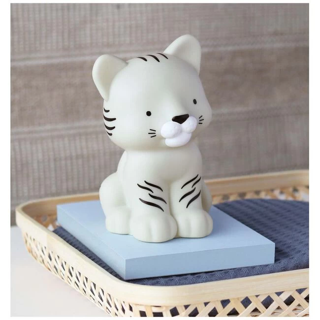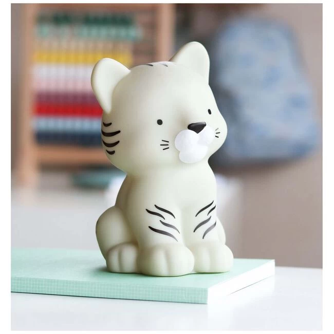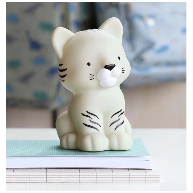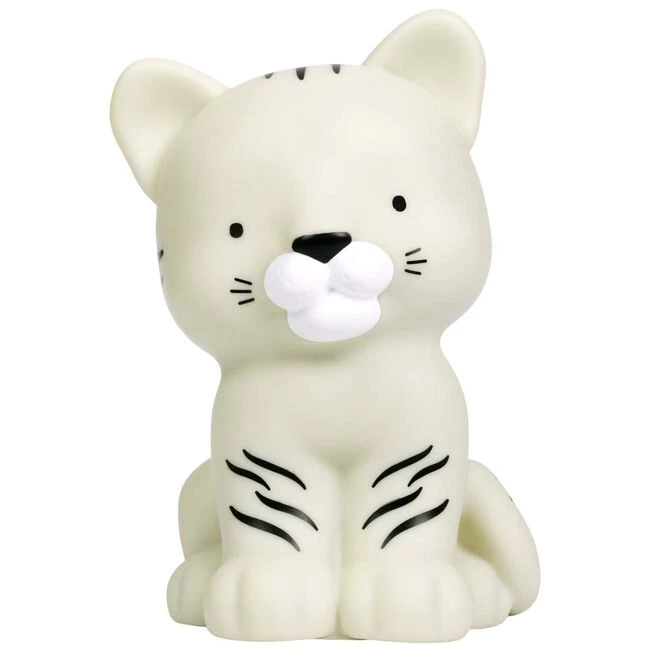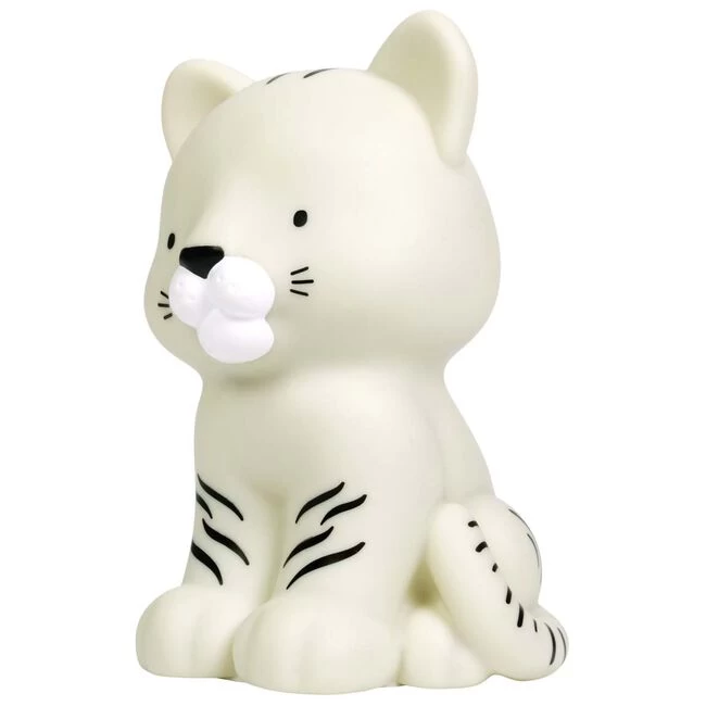 Dit kleine nachtlampje van a Little Lovely Company is een echte eyecatcher voor de babykamer. Het lampje geeft een zachte gloed waardoor hij perfect is als nachtlampje om bij in slaap te vallen. In het lampje zit een LED-lamp waardoor hij niet heet wordt. Je kindje kan hem dus rustig mee in bed nemen. Het nachtlampje werkt op batterijen (niet bijgeleverd). Dankzij de slimmer timer optie schakelt het lampje na 15 minuten automatisch uit. Het lampje is in de vorm van een stoere witte tijger.