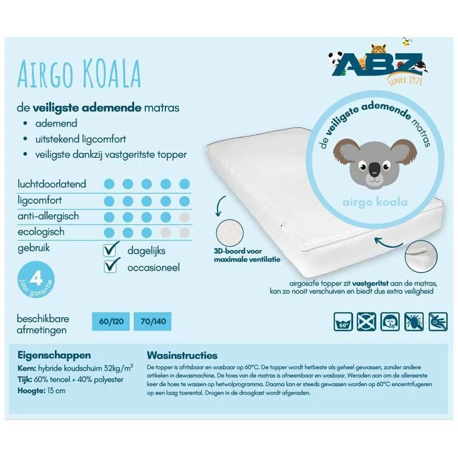 Dit stevige en duurzame airgo koala matras van ABZ bestaat uit een hybride schuim met een natuurlijke tencel-hoes. Aan het matras zit een airgosafe topper vast geritst, die gemakkelijk los te halen is. Deze all-in-one formule heeft een ademende bovenkant en kan als zeer veilig beschouwd worden. De ventilerende boord aan de zijkant zorgt voor een optimale ventilatie en hygiene. De topper en de hoes kunnen gewassen worden op 60°C. Op het matras zit 4 jaar garantie.Afmeting: 60×120 cm en ongeveer 13cm dik.
