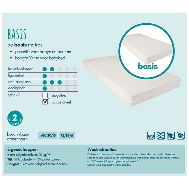 Op dit comfortabel polyether basis matras van ABZ zal je kindje heerlijk slapen. Het matras is gevuld met hoogwaardig polyetherschuim. Het bied stevigheid en is voorzien van een afritsbare, wasbare hoes ( met 2-zijdige rits) die gewassen kan worden op 60 graden. Het matras voldoet aan de Europese normen en is vooral geschikt als logeermatras. Afmeting: 60×120 cm en (ongeveer) 10 cm dik.