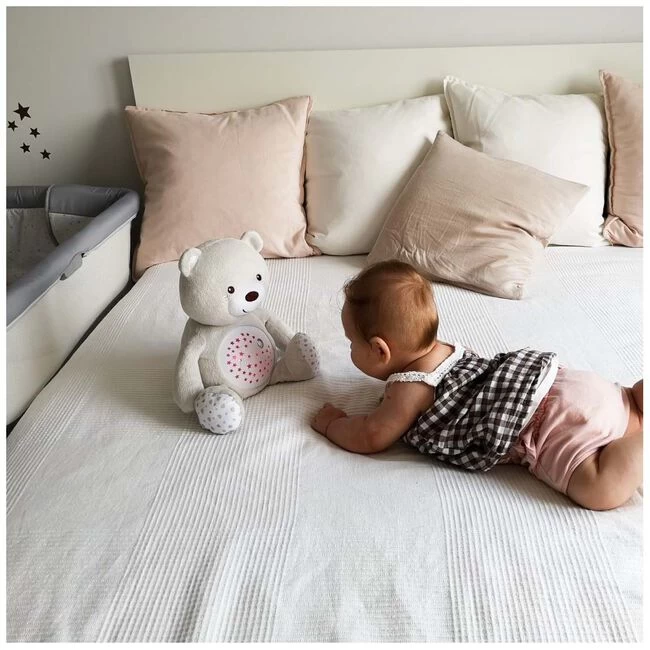 De Chicco beer licht projector is een knuffel met licht en geluiod in een zacht fluwelen stof. De projector heeft een lichtprojectie met drie standen en verandert automatisch van kleur. Daarnaast biedt de projector 30 minuten aan klassieke muziek, New Age, Jazz en natuurgeluiden. De knuffel is wasbaar in de machine. Kleur: Beige/off-white.