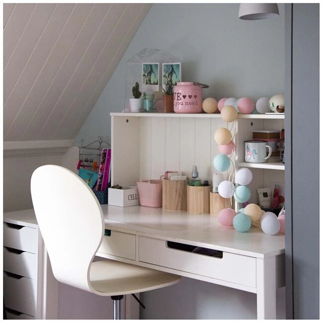 Deze leuke sfeervolle katoenen licht balletjes zijn een mooie toevoeging aan de kinderkamer. Handig tijdens een nacht voeding als nachtlampje maar vooral leuk als speelse decoratie op de kamer van je kindje. Met Cotton balls creëer je op een vrolijke manier meer sfeer. Heb je al een starter set en wil je deze graag uitbreiden met meer lampjes? Dan heb je deze extension kit nodig. Deze kit bestaat uit 20 lampjes. Je kan je lichtsnoer verlengen tot maximaal 60 lampjes. De katoenen bolletjes uit deze uitbreidingsset zijn in de mooie pastel tinten: roze, blauw, geel en wit. Zowel de starter set als de extention kit zijn verkrijgbaar bij Prénatal. Beschikbaar in diverse kleur.