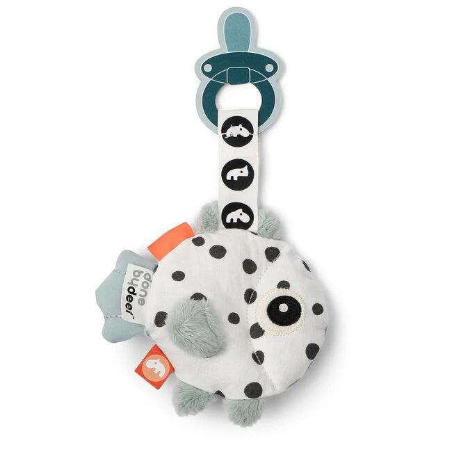 Dit speenkoord heeft de vorm van een vrolijke vis. Je kleintje is op deze manier nooit meer zijn speentje kwijt. De vis kan aan iedere speen bevestigd worden door de combinatie van een elastiek en een klitterbandclip.