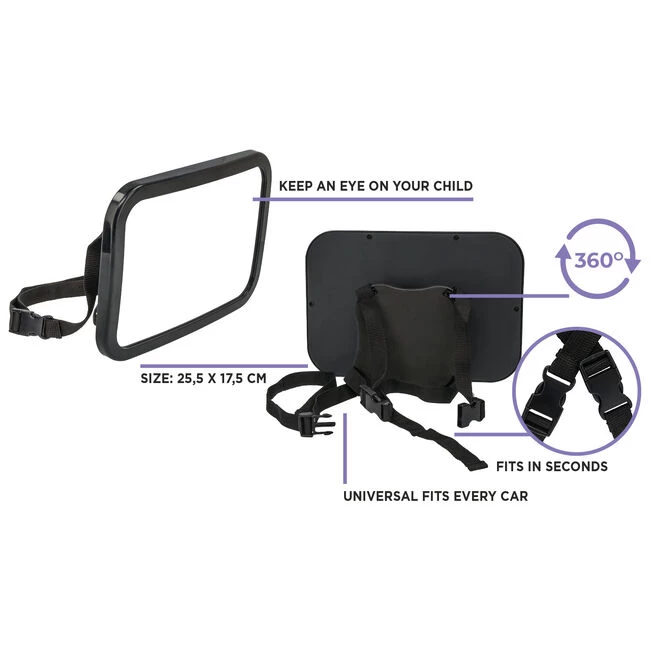 De veiligste manier om kinderen in de auto te vervoeren is achterwaarts op de achterbank! Maar in deze positie is het soms moeilijk te zien hoe het met je kindje gaat als je zelf achter het stuur zit. Met de Dooky autospiegel hou je steeds oogcontact met je kind zonder over de schouder te hoeven kijken. De spiegel is snel en eenvoudig te bevestigen met 2 spanbanden aan de hoofdsteun boven het autozitje van je kind. De spiegel meet 25,5 x 17,5 cm en is 360 graden draaibaar zodat je elke gewenste positie kunt kiezen om je kindje goed in de gaten te houden. De Dooky Autospiegel is gemaakt van hoogwaardig materiaal.
