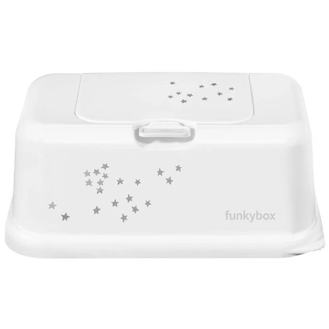 De funkybox is een doekjesdoos waarin je babybillendoekjes bewaart. Deze box is onmisbaar in de babykamer en staat bijna altijd op of bij de commode. De funkybox is verkrijgbaar in superstoere, vrolijke en hele schattige dessins. De Funkybox is gemaakt van kwalitatief hoogwaardig kunststof. Het klepje van de box springt, met 1 druk op de knop, makkelijk open en sluit goed. In de deksel zit een ring die in een ring op de box past, wat uitdroging tegengaat. De deksel aan de onderkant gaat ook makkelijk open en dicht.