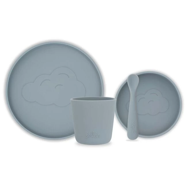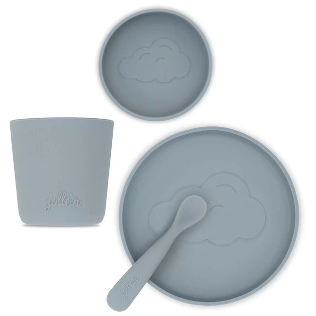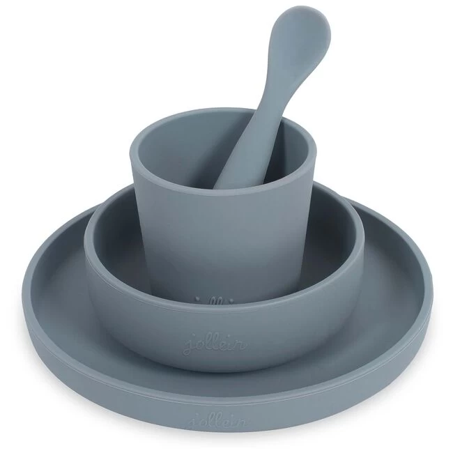 Leuk kinder serviesset van Jollein. De serviesset is gemaakt van 100% siliconen en bestaat uit een bordje, een kommetje, een bekertje en een lepeltje. Onder het bordje en het kommetje zit een handige zuignap en alle onderdelen zijn zowel vriezer, magnetron als oven bestendig. Ook kunnen de siliconen dinersetjes goed in de vaatwasser. Dit eetssetje is in verschillende kleuren verkrijgbaar.
