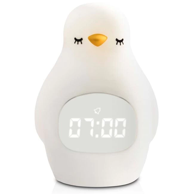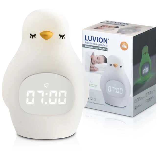 Deze Luvion slaaptrainer in de vorm van een pinguin is ideaal om je kleintje te leren wanneer het nog geen tijd is om op te staan. Dit doe je door de slaaptrainer functie in te stellen op de gewenste tijd. Het lampje zal dan vanaf een half uurt voor de ingestelde tijd gaan branden, in het geel, als teken dat het bijna tijd is om op te staan. Op de ingestelde tijd veranderd de kleur naar groen als teken dat je kindje uit bed mag komen. Doordat er alleen een lichtje gaat branden wanneer het tijd is om op te staan zal je kindje hierdoor niet worden wakker gemaakt. Daarnaast bevat de pinguin een nachtlampje, leuk en handig om ‘s avonds met het naar bed gaan te gebruiken als nachtlampje.