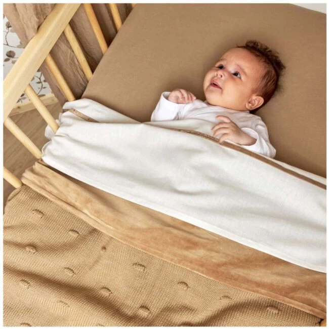 Onder de Meyco wiegdeken Knots Velvet kan je kindje heerlijk wegdromen. Dit zachte dekentje bestaat uit twee lagen. De gebreide voorzijde van 100% katoen heeft een gemêleerd effect door het gebruik van twee kleuren en geeft de deken een stoere twist. De achterzijde is van velours van 80% katoen en 20% polyester. Hij past perfect in de wieg en kan ook worden gebruikt in de kinderwagen.