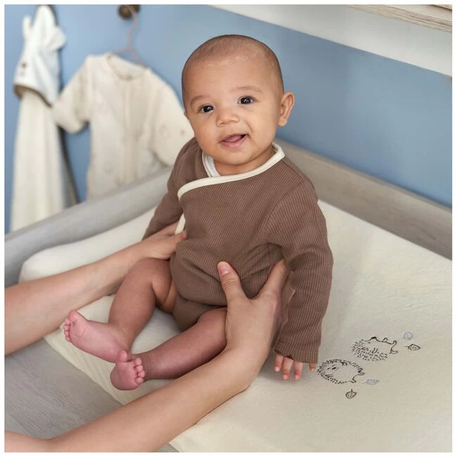 Deze Prénatal aankleedkussenhoes met geborduurd egeltje komt uit ons thema Forest Friend. De hoes zorgt ervoor dat je kindje heerlijk zacht kan liggen tijdens het verschonen en aankleden. De aankleedkussenhoes past om een standaard aankleedkussen. Materiaal is van 100% katoen en is wasbaar op 40°C.