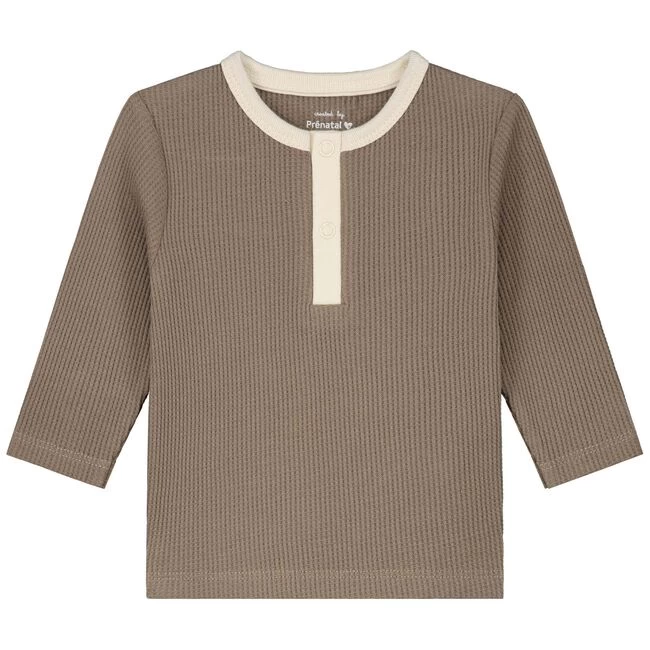 Deze Prénatal baby pyjama is gemaakt een comfortabele katoenen wafel kwaliteit. De pyjama is taupe bruin van kleur en is afgewerkt met een zand kleurige binding rondom de hals. Aan de voorzijde zitten drukknoopjes. Door de drukknoopjes en de elastische tailleband is het pyjamaatje gemakkelijk aan en uit te trekken bij je kleintje. Materiaal: 100% katoen. Binnenstebuiten wassen op maximaal 40 graden met gelijke kleuren.