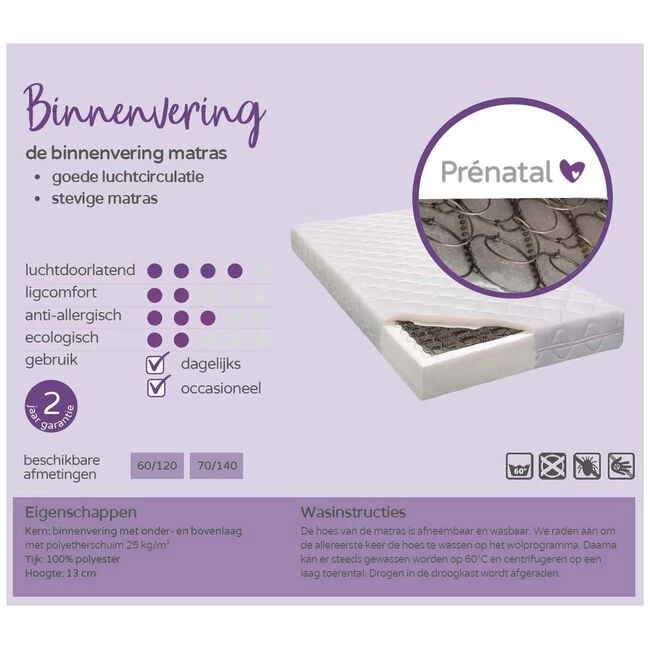 Op dit Prenatal binnenveringsmatras zal je kindje heerlijk slapen. Het matras heeft een kern van bonnelveren en polyether. Hierdoor heeft het matras een lange levensduur en permanente elasticiteit. Het matras heeft een anti-allergische en afneembare hoes, die gewassen kan worden op 60 graden. Afmeting: 60×120 cm en (ongeveer) 13cm dik. Dit matrasje is ook verkrijgbaar in de maat 70×140