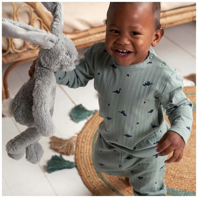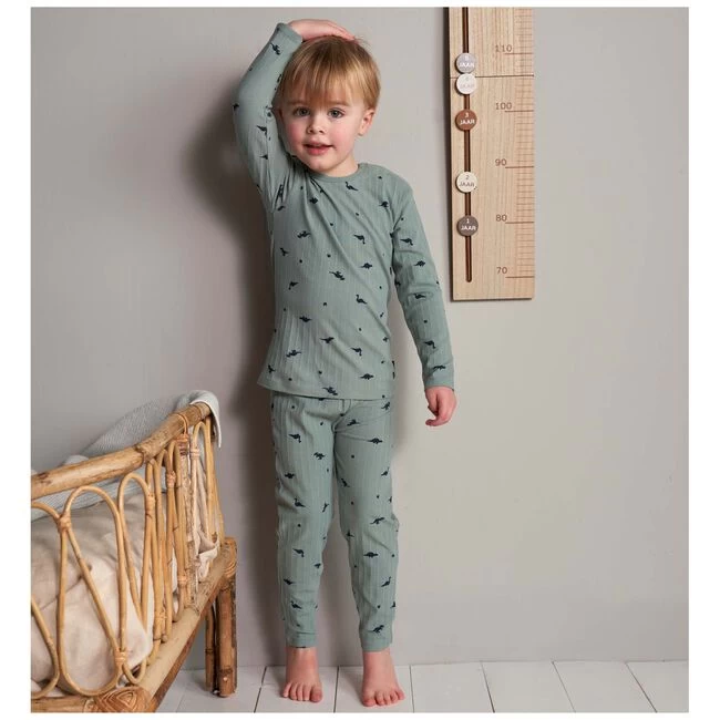 Deze Prénatal peuter pyjama is gemaakt van een mooie rib kwaliteit en is groen van kleur met een leuke all over dino print. Door de knoopsluiting op de schouders is het pyjamaatje gemakkelijk aan en uit te trekken bij je kleintje. De pyjama sluit aan bij het Dino thema van Prénatal. Wasvoorschrift: binnenstebuiten wassen op 30 graden met gelijke kleuren. TOG waarde: 0.5 TOG.