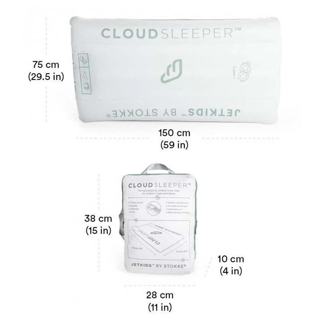 De CloudSleeper van het merk Stokke is het alles-in-een opblaasbaar reisbed voor peuters en kleuters. Het is licht en compleet, waardoor je het makkelijk in de Stokke JetKids, je rugzak of handbagage stopt. Met de geïntegreerde pomp heb je in een minuut een comfortabele slaapplaats. Duurzaam TPU-gecoat opblaasbaar matras op nylon basis, gelijkwaardig materiaal als een hoogwaardige slaapmat. Het air mesh hoeslaken helpt de lichaamstemperatuur te reguleren en geeft je kind extra ondersteuning. Ook biedt de stootrand over de gehele lengte extra veiliheid. De onderkant is waterafstotend. Uitgevouwen afmeting 75x 150 cm.