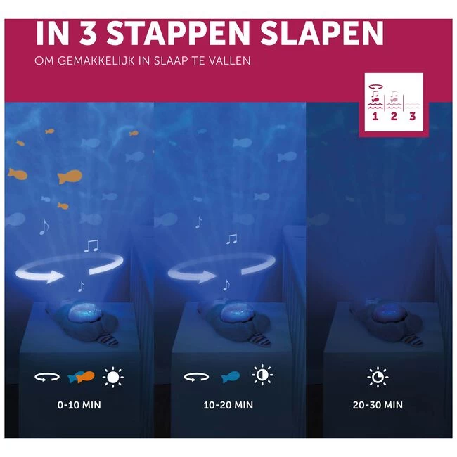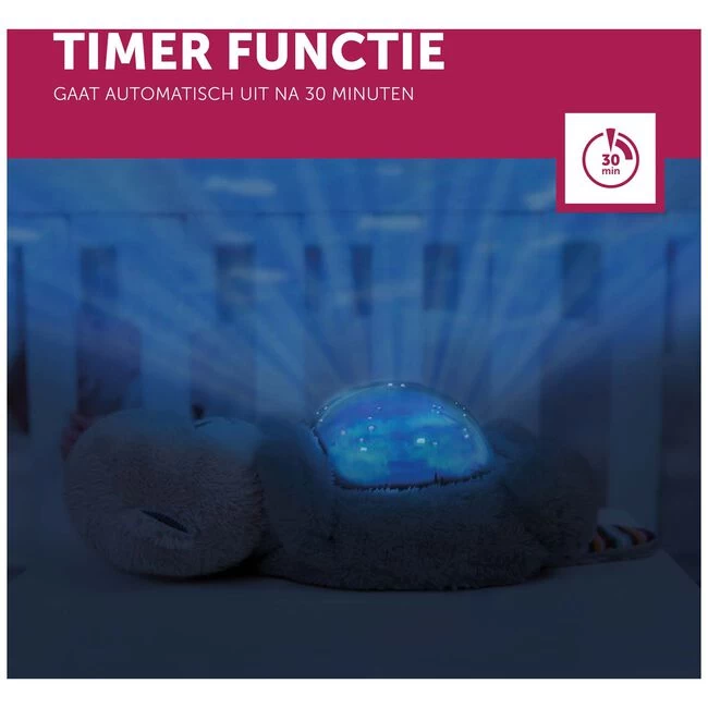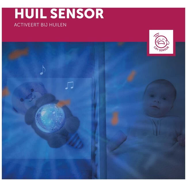 Deze Zazu lichtprojector in de vorm van een otter helpt je kindje om rustig in slaap te vallen. De lichtprojector projecteerd een onderwaterwereld met golven en visjes. Daarnaast kan de projector verschillende geluiden afspelen, namelijk hartslaggeluiden, oceaangeluiden en rustige liedjes. De projectie schakelt automatisch uit na 30 minuten. Ook heeft de lichtprojector een huilsensor en zal vanzelf weer aan gaan wanneer je kindje aan het huilen is. De volume is aan te passen op twee verschillende niveaus.